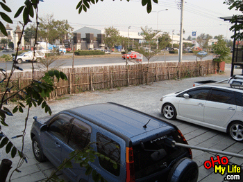 สงสัยว่านี้ถ้าค่ำๆ หน่อยเปิดไฟคงสวยไปอีกแบบ ที่นั่งจะเป็นแบบเล่นระดับ มีภาพตกแต่งตามผนัง เข้ากับร้านดีจ้า ด้านข้างก็เป็นที่จอดรถด้วย |
